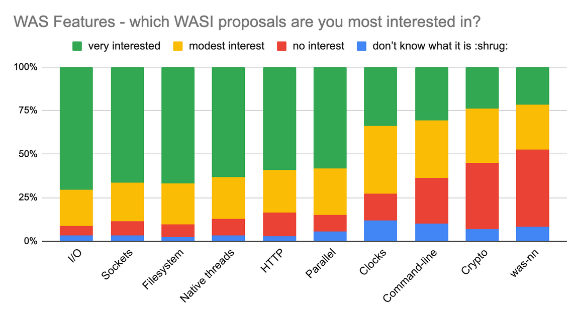 WebAssembly System Interface (WASI), which adds further system-level integration APIs to WebAssembly is becoming increasingly important, so I also asked which WASI proposals people are most interested in: