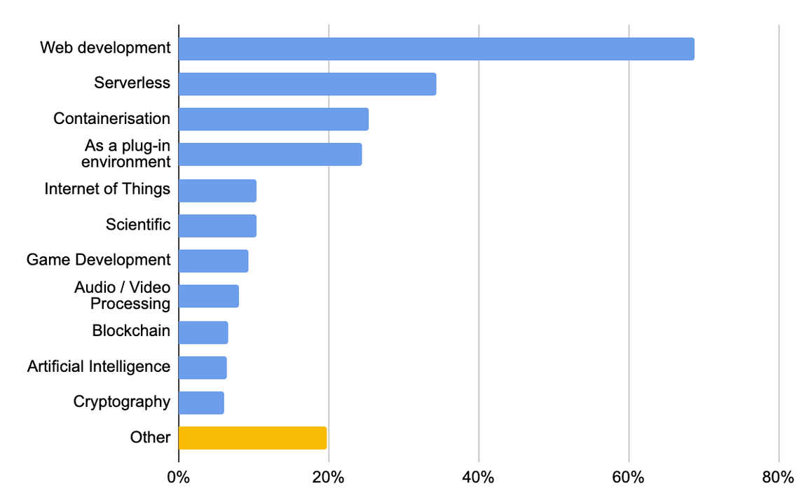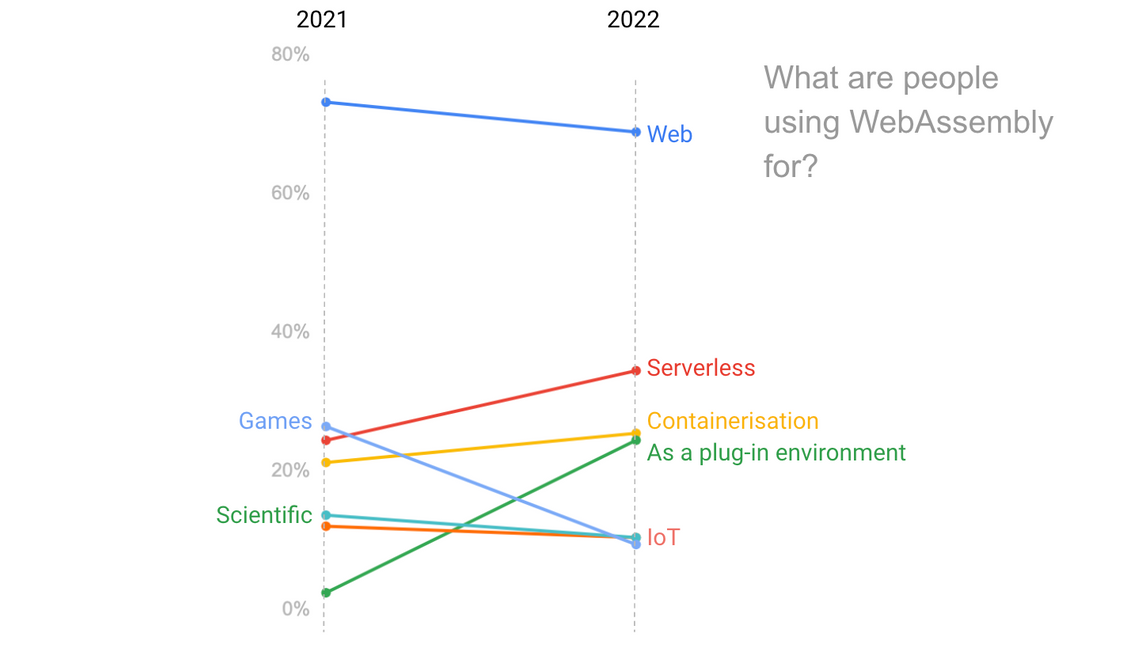 - The use of WebAssembly for Serverless, Containerisation and as a plug-in host has climbed significantly