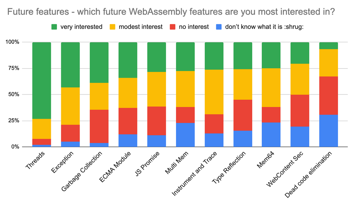 The threads proposal, which adds shared linear memory and atomics, comes out on top, followed by support for exceptions and garbage collection.